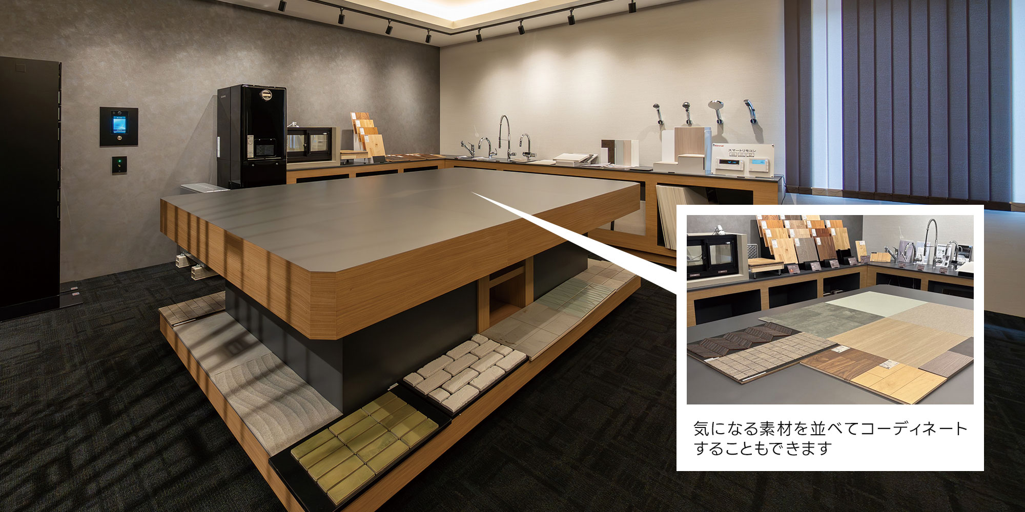 フローリングや壁材、水まわり設備などの実物サンプルを手に取りながら、質感や色味をじっくり比較・検討できる展示室。設備の模型展示やデモンストレーションもあり、オプション価格もその場で確認できます。