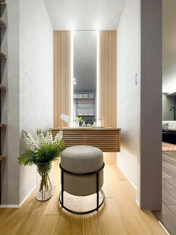 床やドア、照明、スイッチ・コンセント、ドアノブまで、多彩な素材を見て触れて選べる展示室。木の温もりや質感を実際に体感できます。床材に本物の木を使っているのは、木材加工から始まった、なかやしきグループならではのこだわりです。