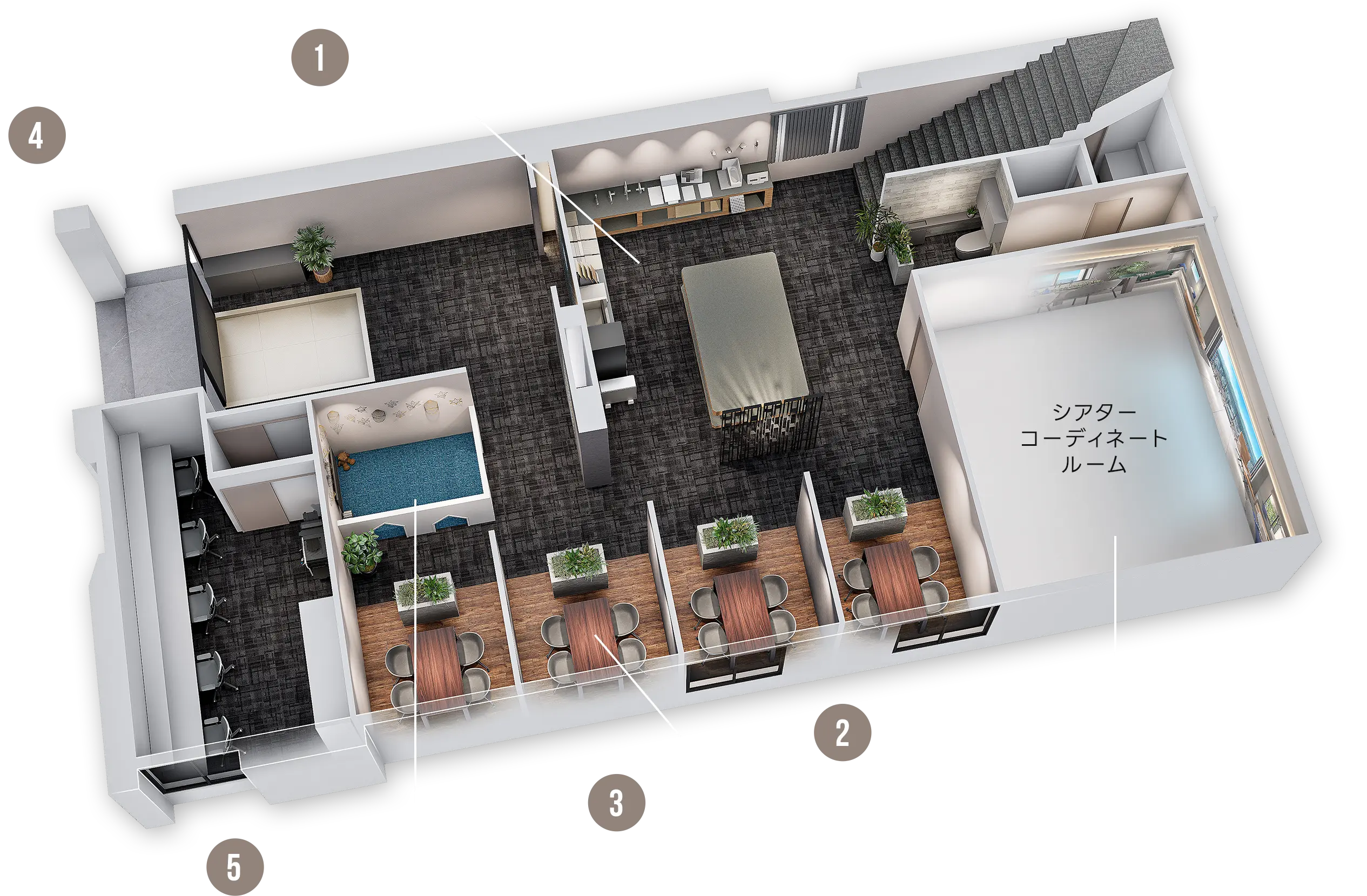 九州初のシアターコーディネートルームでは、四面スクリーンに映し出される実物大のバーチャル空間で、間取りやカラーの変更をその場で体感。図面だけでは見えにくい暮らしのイメージを、リアルに確認しながら進められます。