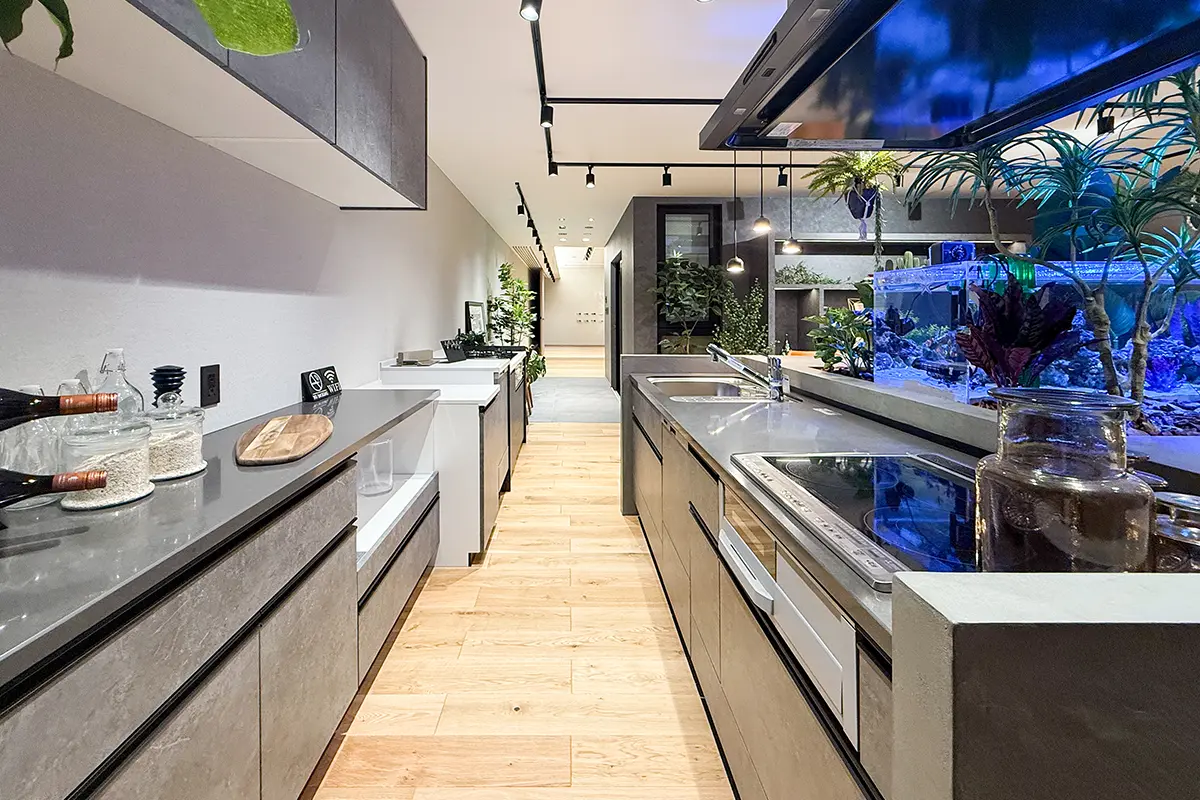 おしゃれで居心地の良いカフェスペース。くつろぎの時間を過ごしながら、キッチン周りの設備やオプションをじっくり確認できます。暮らしのイメージを膨らませる、発見の場にもなります。