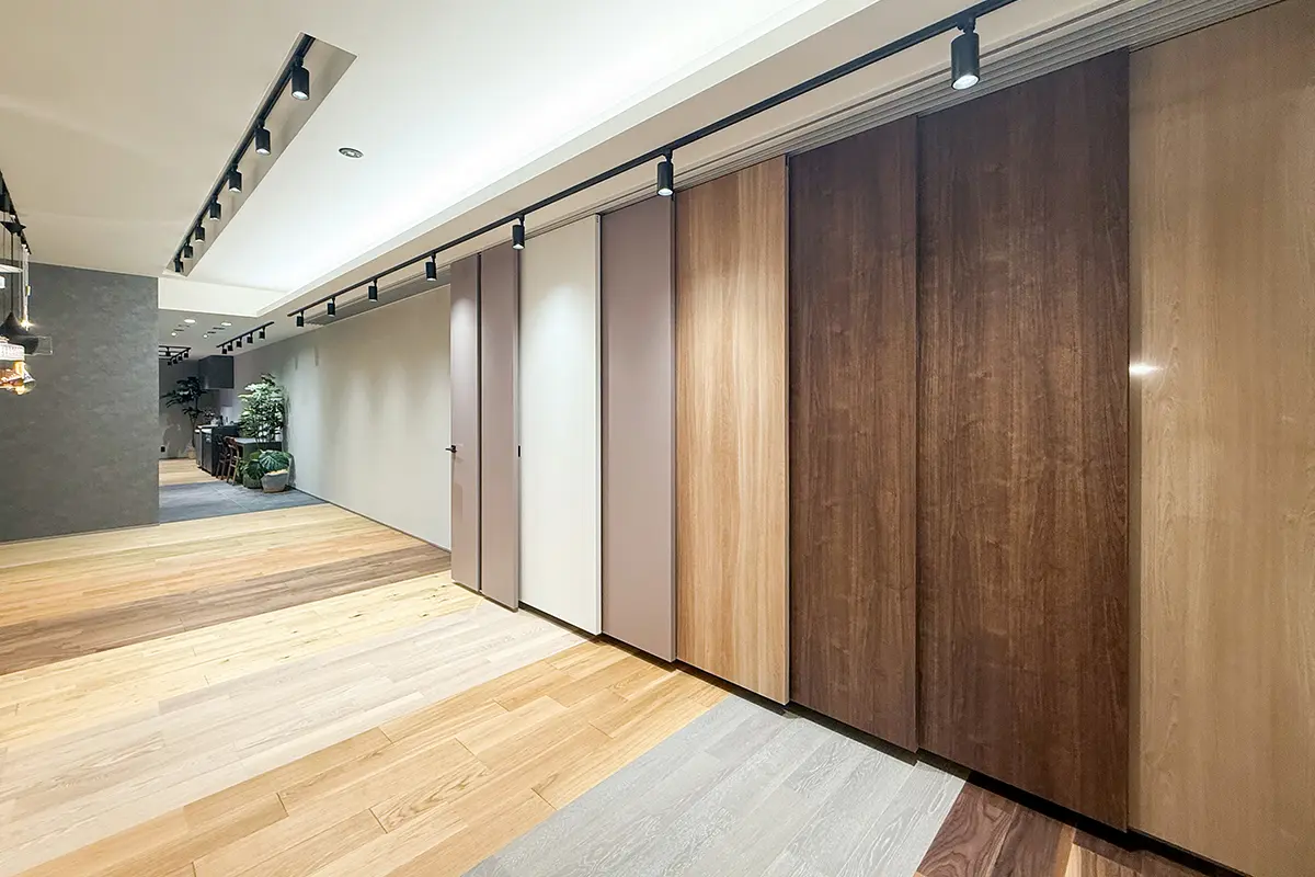 床やドア、照明、スイッチ・コンセント、ドアノブまで、多彩な素材を見て触れて選べる展示室。木の温もりや質感を実際に体感できます。床材に本物の木を使っているのは、木材加工から始まった、なかやしきグループならではのこだわりです。